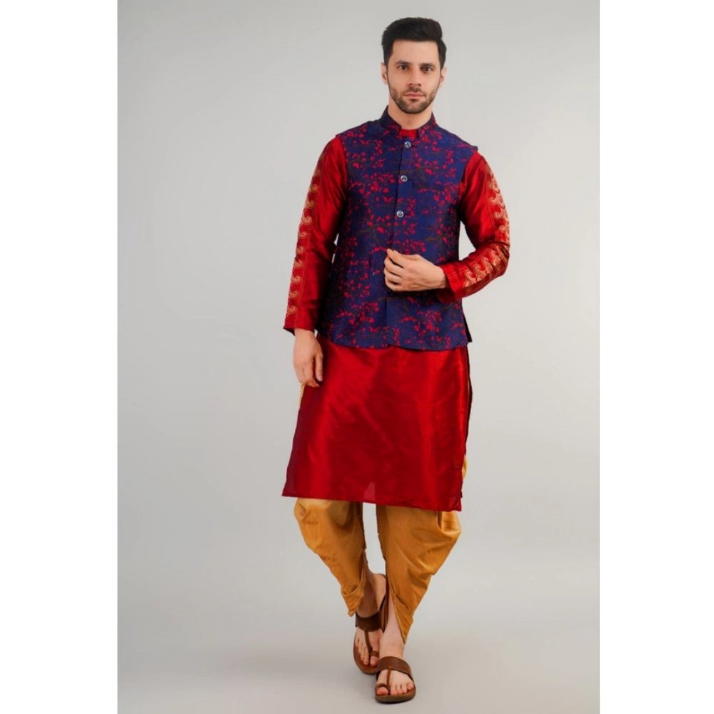 Generic Men's Jacquard Self-Design Sleeveless Mandarin Neck Waistcoat (Blue-Red)