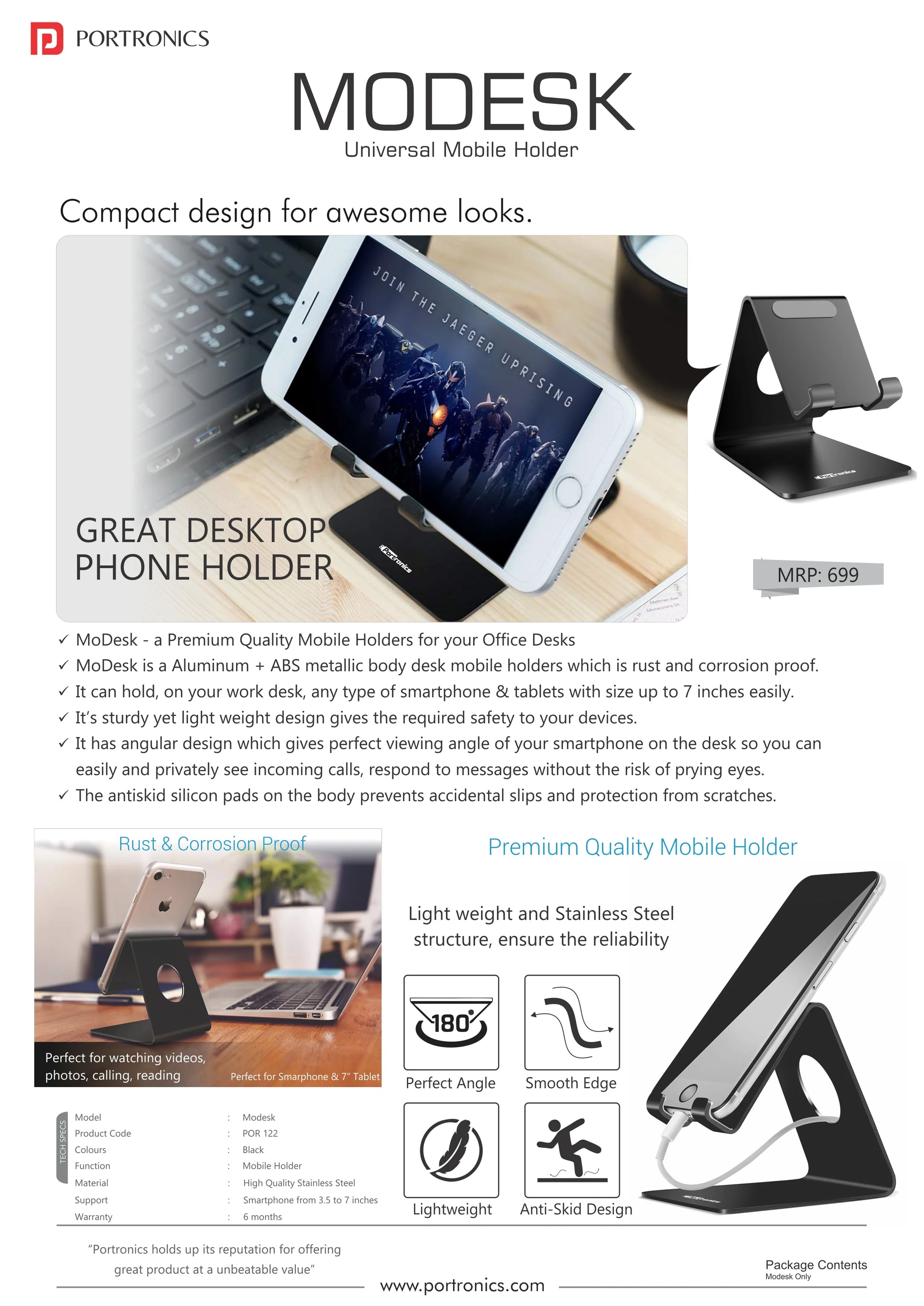 - MoDesk - a Premium Quality Mobile Stand/Holders for your Office Desks, It can hold, on your work desk, any type of smartphone and tablets with size up to 7 inches easily MoDesk is a Aluminium + ABS metallic body desk mobile holders which is rust and corrosion proof
