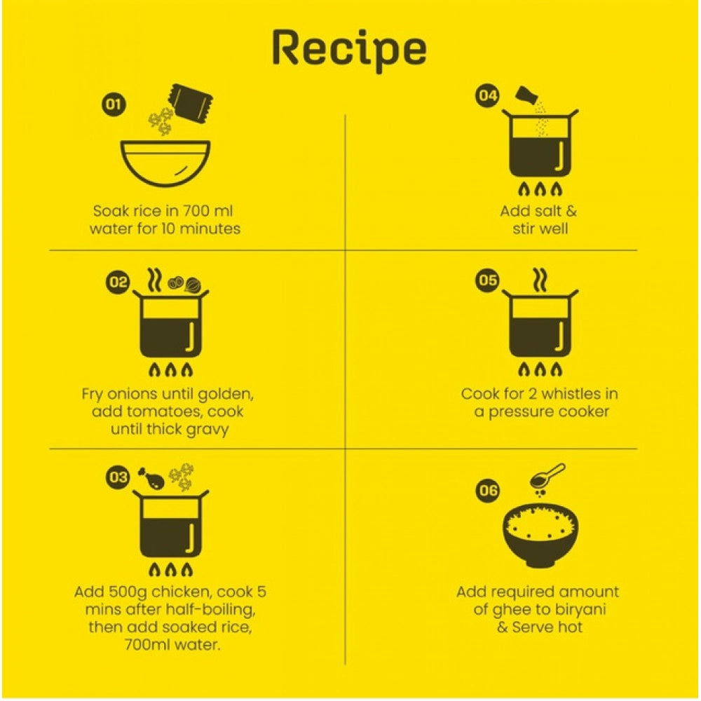 Ingredients: Basmati Rice, Kashmiri Chilli, Black Pepper, Salt, Turmeric, Coriander Powder, Onion Powder, Ginger Powder, Garlic Powder, Cassia Powder, Cardmon Powder, Refined Sunflower, Oil,