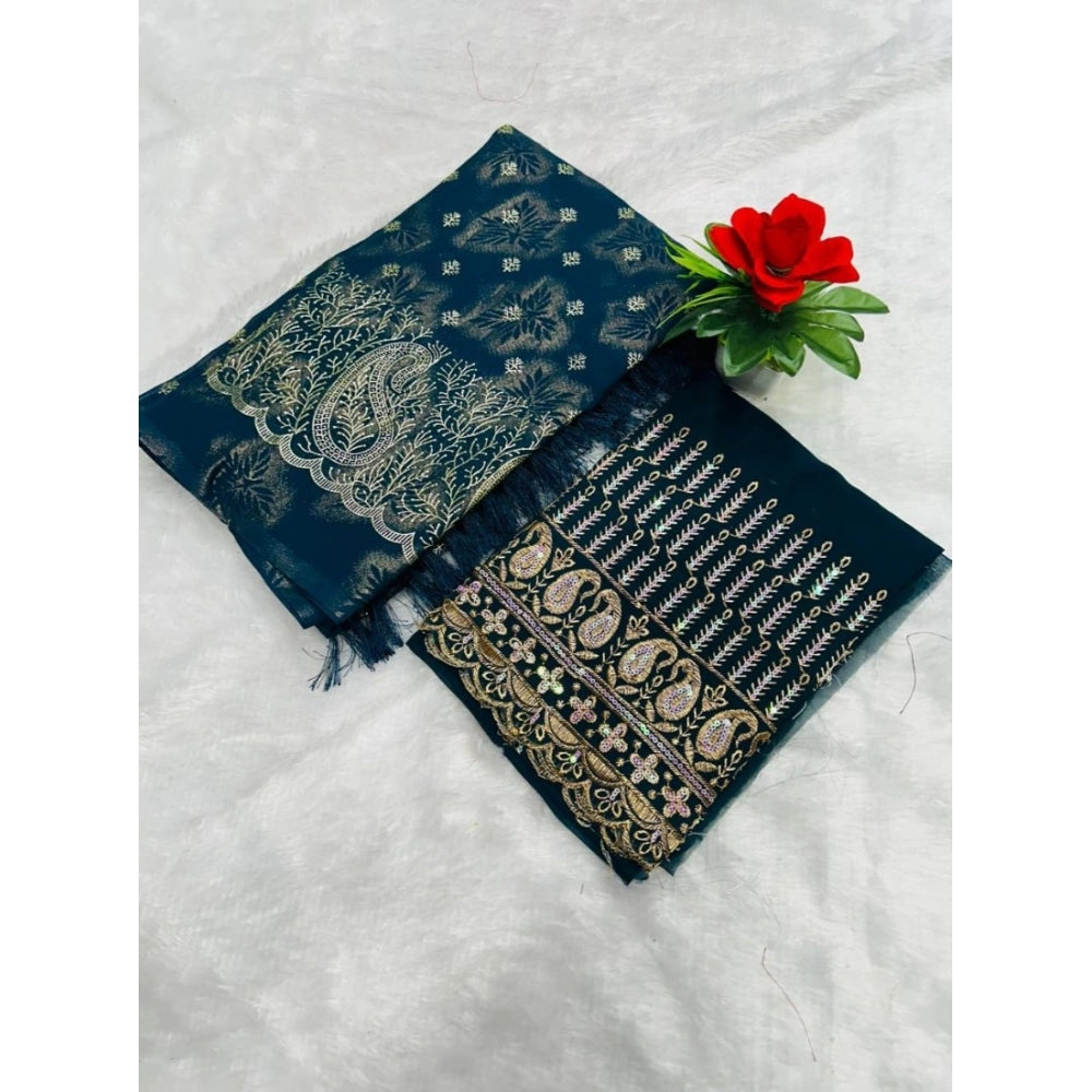 Generic Women's Embroidered Georgette Saree With Unstitched Blouse (Dark Blue, 5-6 Mtrs)