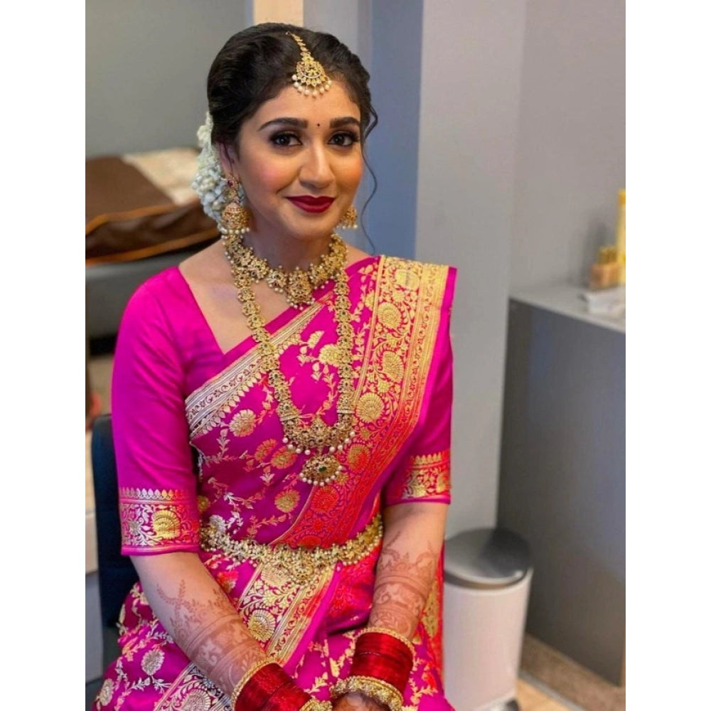 Generic Women's Litchi silk Printed Saree With Unstitched Blouse (Pink)