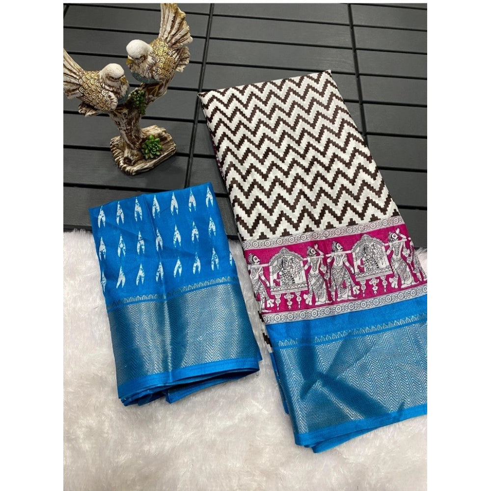 Generic Women's Soft Dola Cotton Kalamkari Printed Saree With Unstitched Blouse 5.5Mtr (Sky Blue)