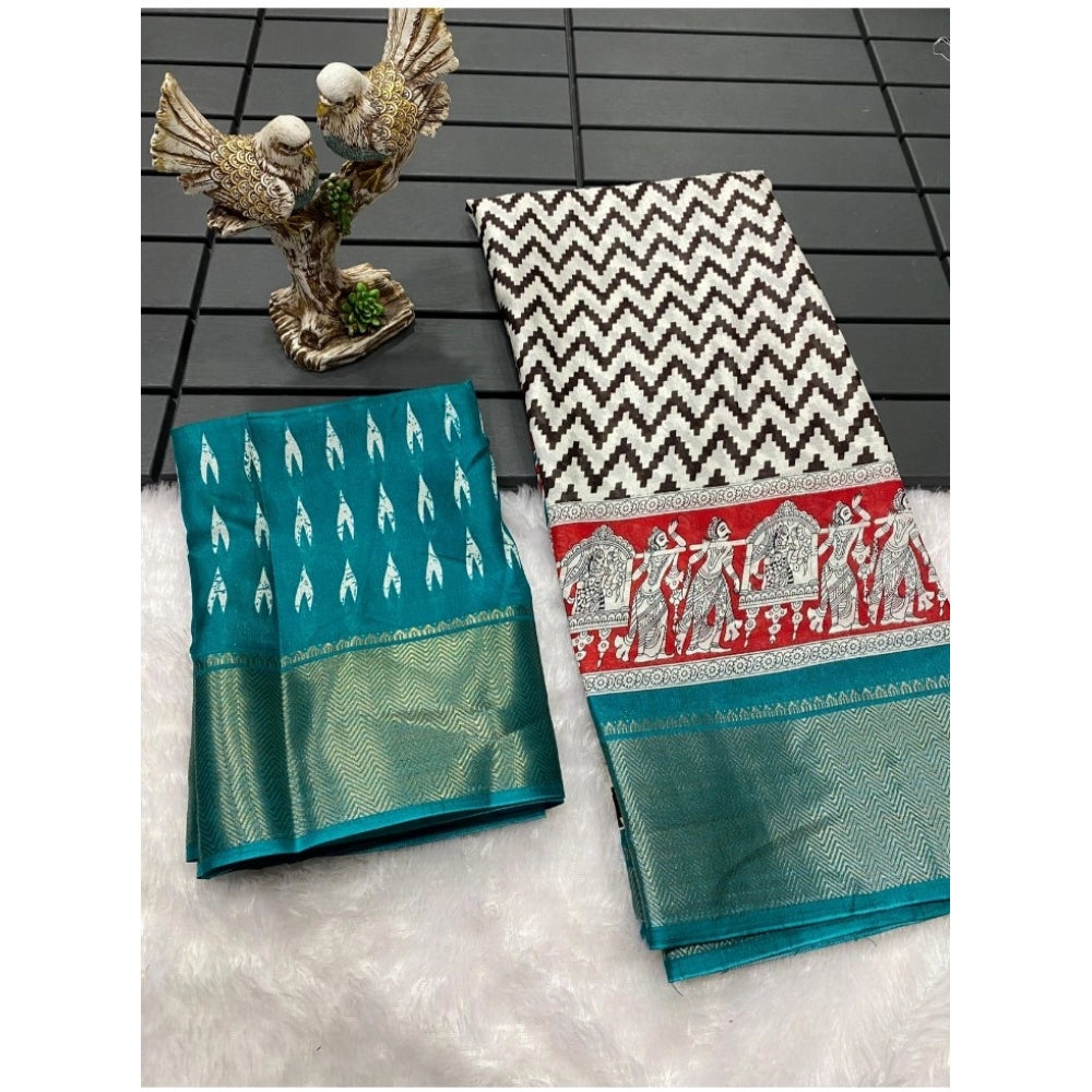 Generic Women's Soft Dola Cotton Kalamkari Printed Saree With Unstitched Blouse 5.5Mtr (Turquoise)