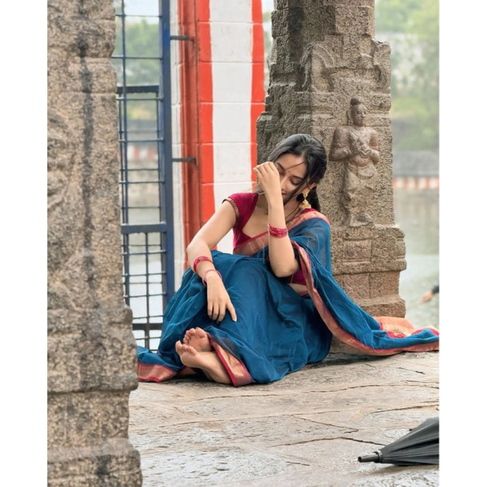 Generic Women's Soft Litchi Silk Jacquard Work Saree With Unstitched Blouse 5.5Mtr (Blue)